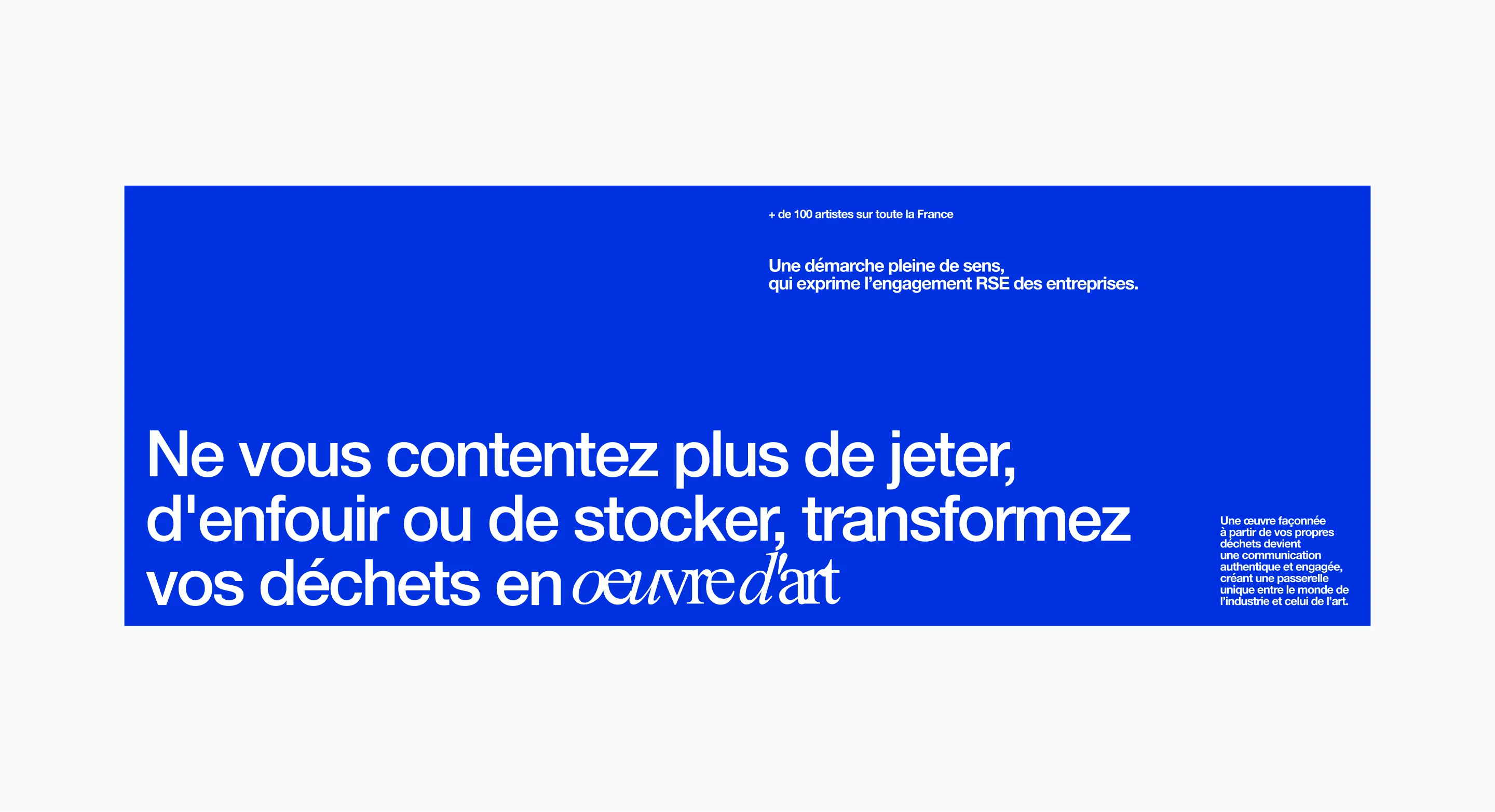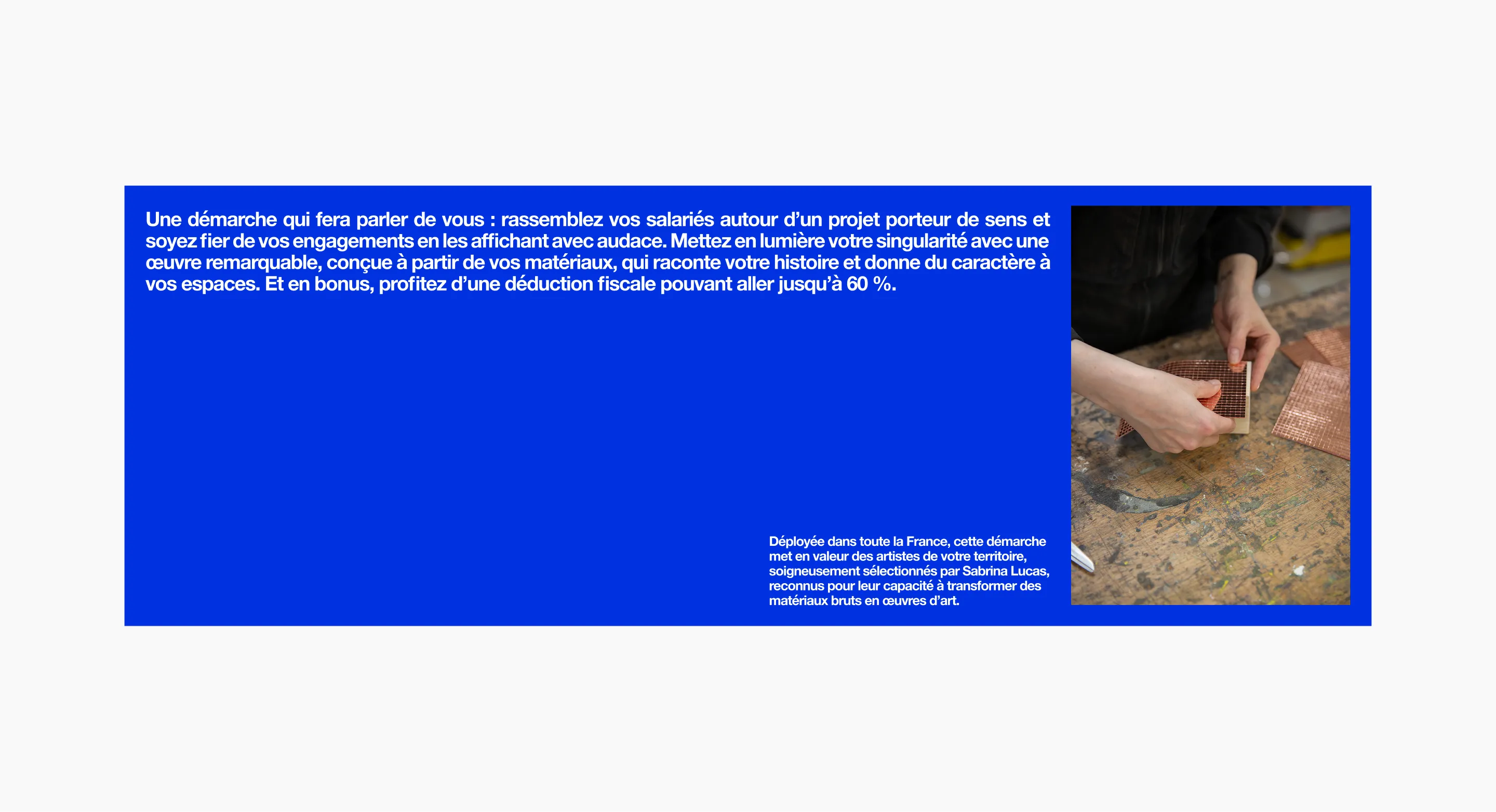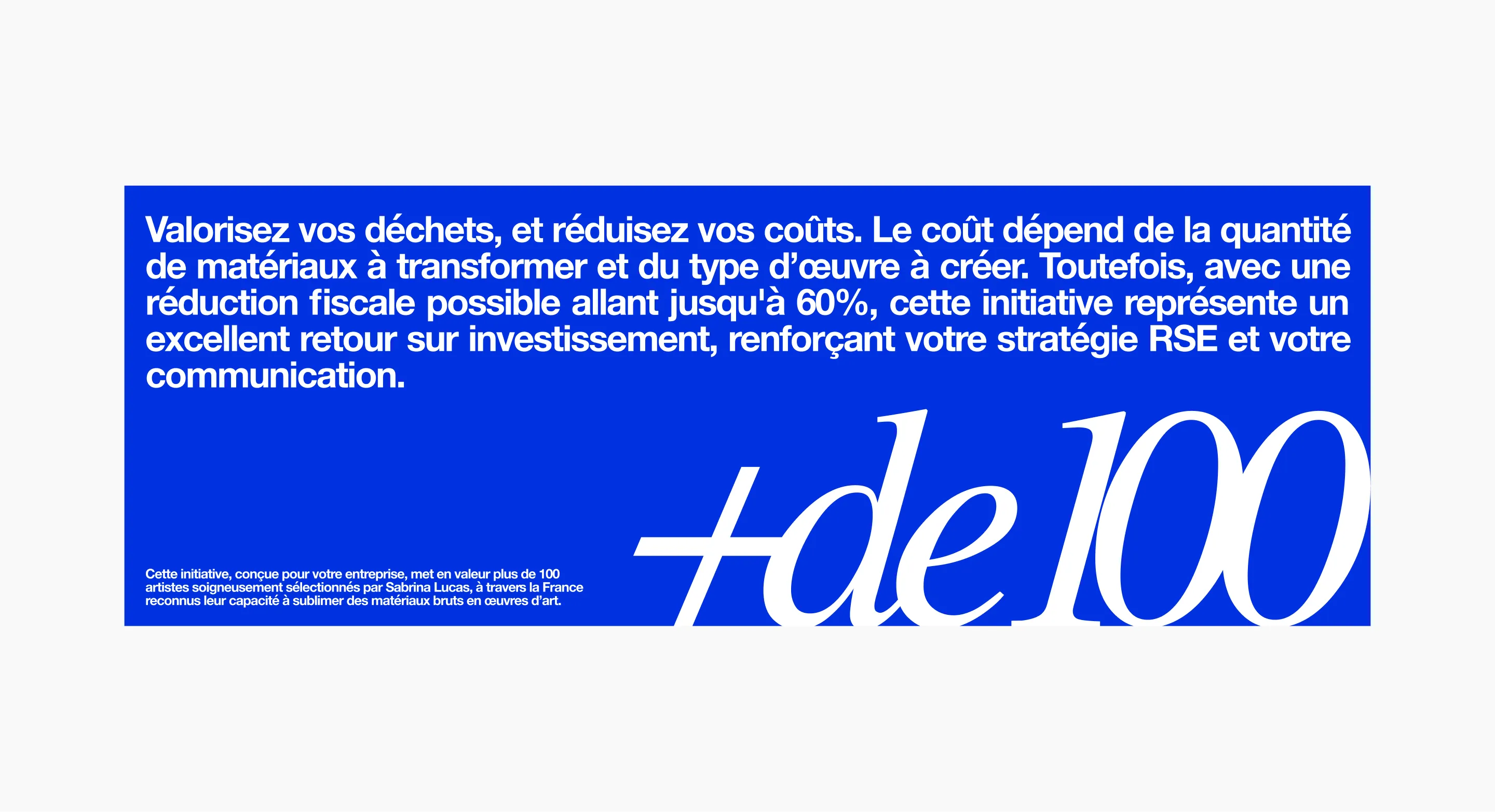 Sabrina Lucas, spécialisée dans la création d’œuvres d’art sur mesure pour les entreprises, lance en 2023 l’initiative « Vos déchets, une œuvre d’art », visant à transformer les déchets industriels en créations artistiques dans une démarche RSE inscrite dans France 2030.